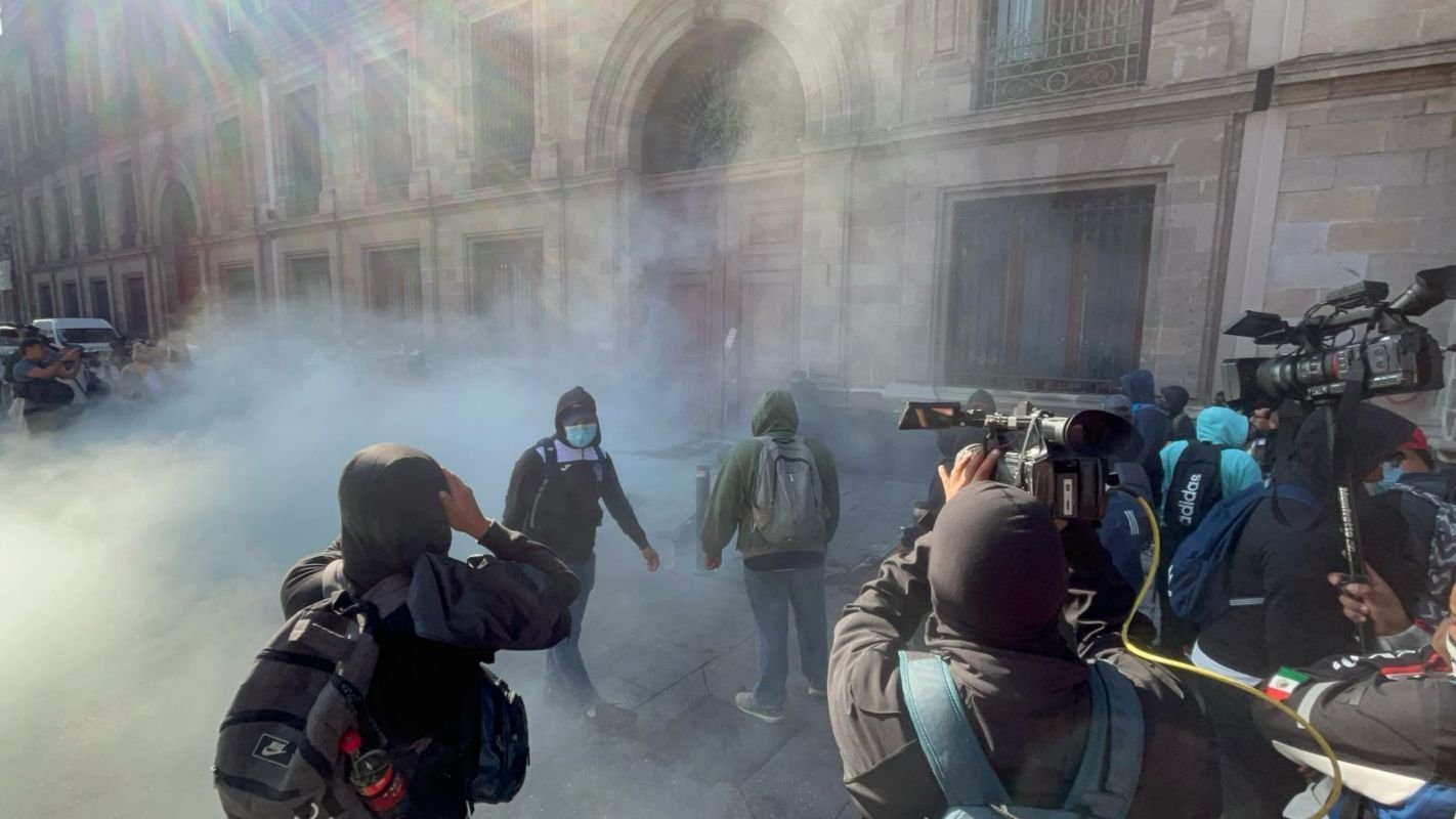Estudiantes de la Escuela Normal Rural de Ayotzinapa “Isidro Burgos” llevaron a cabo una manifestación esta mañana frente a Palacio Nacional, coincidiendo con “La mañanera” del presidente Andrés Manuel ópez Obrador. Durante la protesta, un grupo de jóvenes con el rostro cubierto logró ingresar a Palacio Nacional por el acceso de la Calle Moneda número 1, desencadenando una intervención de la Policía Militar para dispersarlos mediante el uso de gas.
